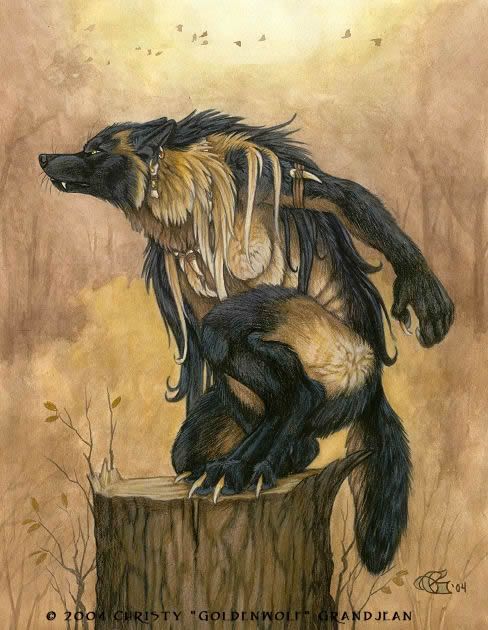 a female lycan stands before you gazing up at the moonlit sky,well toned muscles taunt beneath a fine coat of black and gold, pearly white canines protruding 4 1/2 inches from taunt jaws, as you travel down your eyes fall apon 5 inch claws razor sharp and curved like talons. you also notice her toned legs and arms muscles rippling beneath the surface.She turns to you bright green eyes practically glowing, she looks you up and down showing no emotion then glances back up to the moon turning and running off to where......your afraid to know