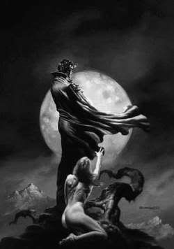 He stands taller then the rest, picth black hair pale skin and misty black eyes. He wears suits of black metal with a long black cape the trails behind him. He protects his friends and family from furball mutt werewolfs. He belongs to no man he dose not follow demands he is the vampire that is crused to walk this land for a pityful enternity all by his lonsome fighting for his clan and nothing else life is lonely to him and he works alone. He is the Weapon , his sword is the tool.